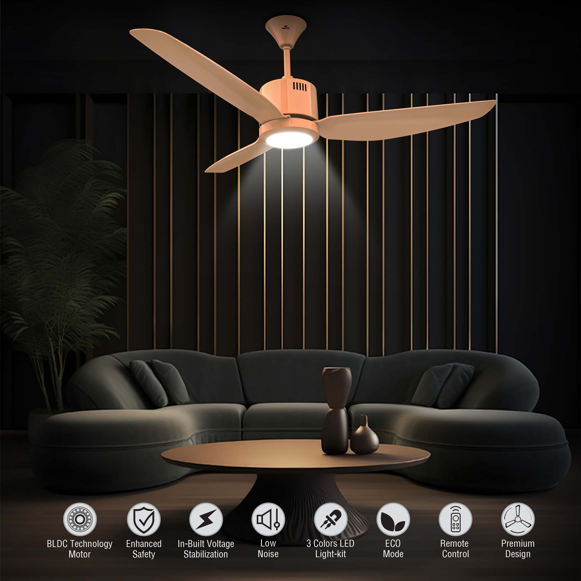 This premium model combines aerodynamic rust-proof blades with a 65% energy-saving BLDC motor, giving you whisper-quiet performance and elegant ambient lighting.