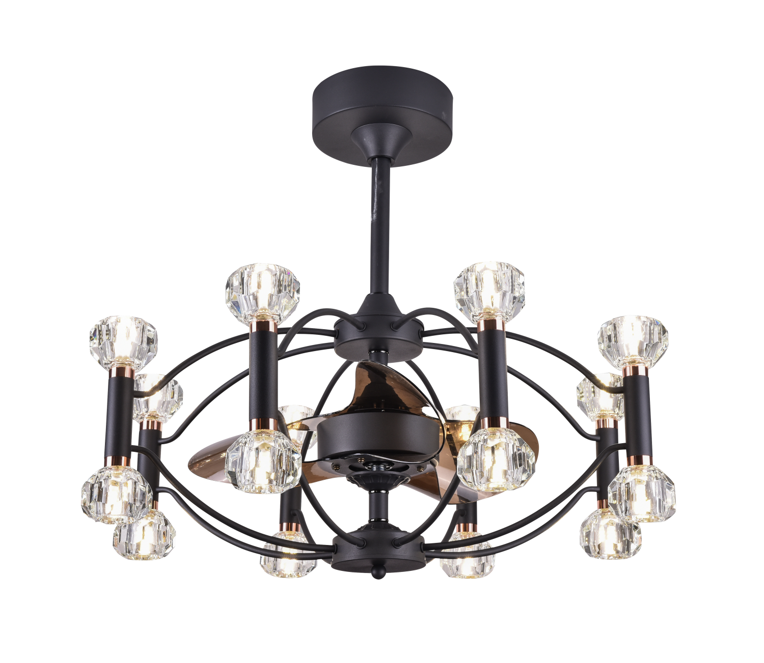 The Breeze Lux Chandelier Ceiling Fan BL-132 is a compact masterpiece that blends crystal chandelier elegance with modern ceiling fan functionality. With a 22-inch size, sleek coffee-colored blades, and a black metal frame, this fan is designed to make smaller spaces stylish and comfortable.