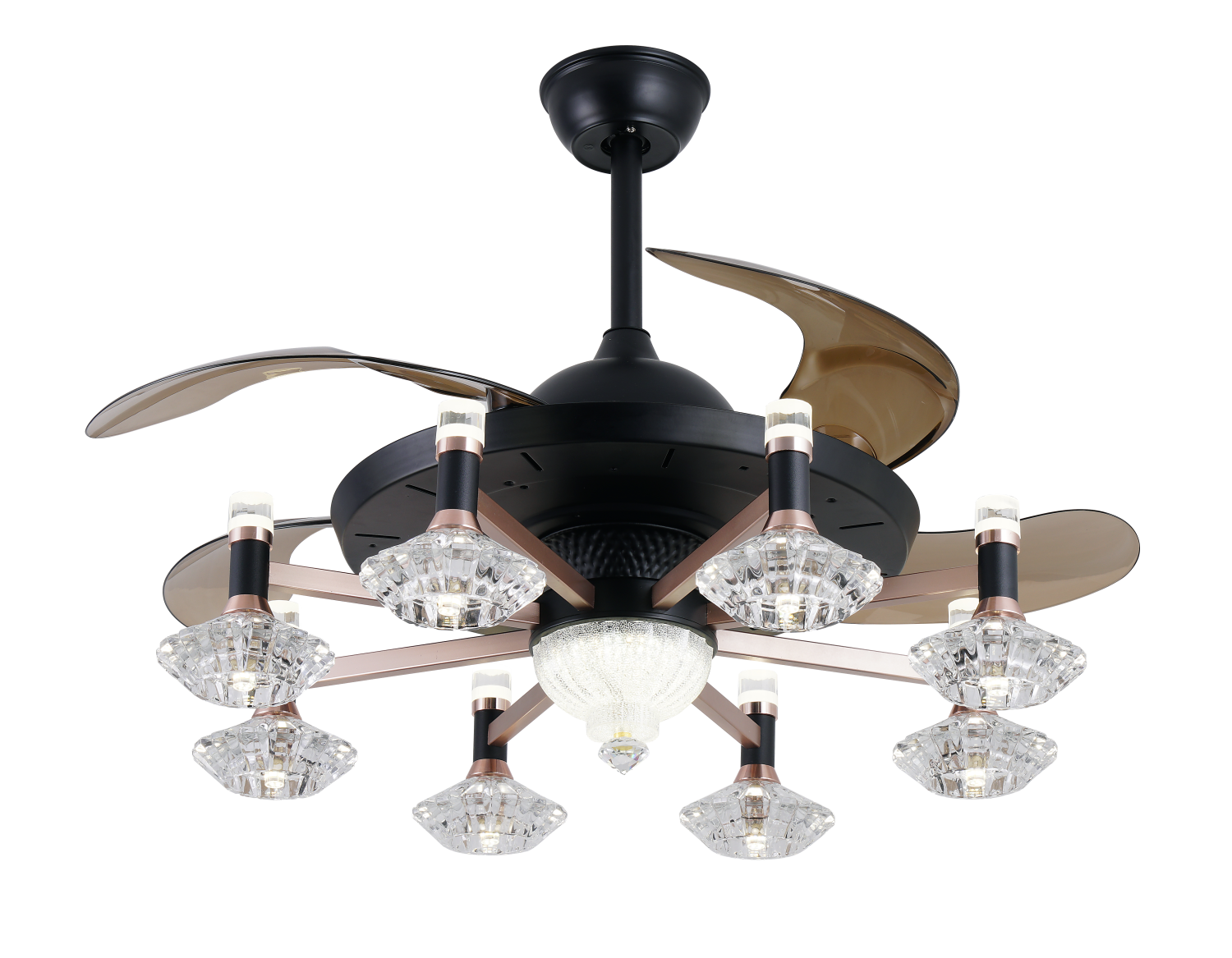 The Breeze Lux Chandelier Ceiling Fan BL-143 is a perfect blend of luxury design and reliable cooling performance. Featuring a black + gold body, elegant coffee-colored blades, and a premium iron + glass chandelier lampshade with 8 G9 light holders, this fan brings both brilliance and comfort to your home.